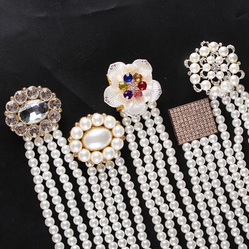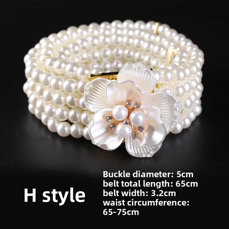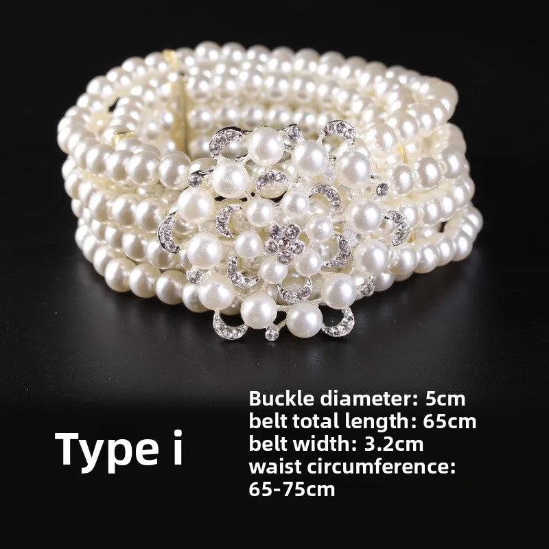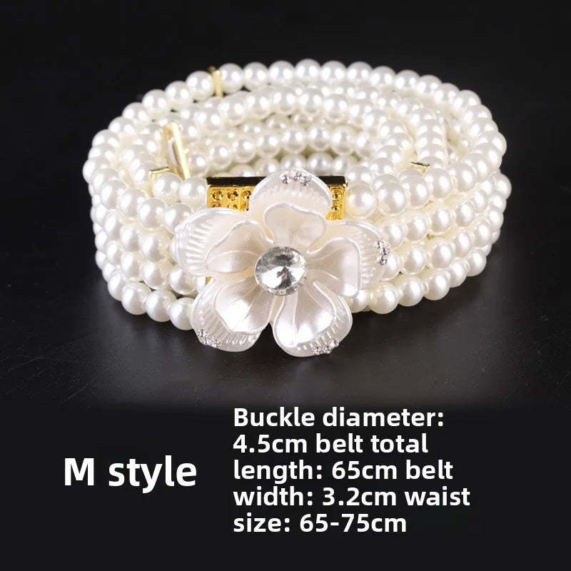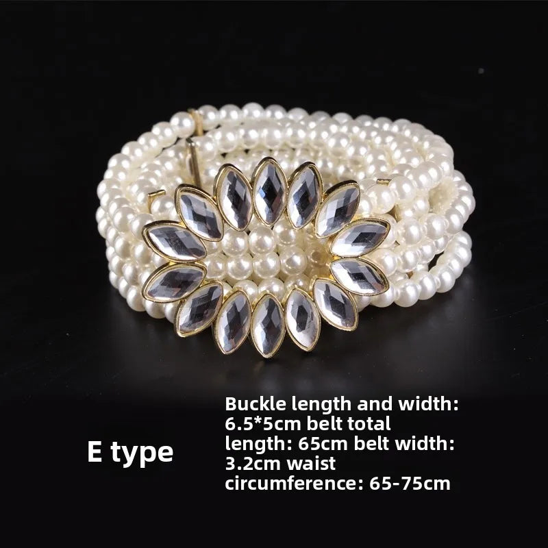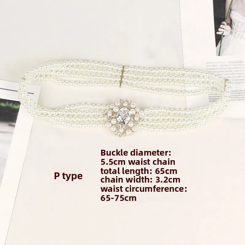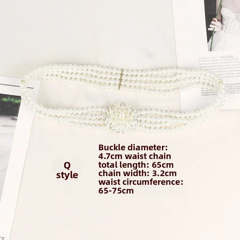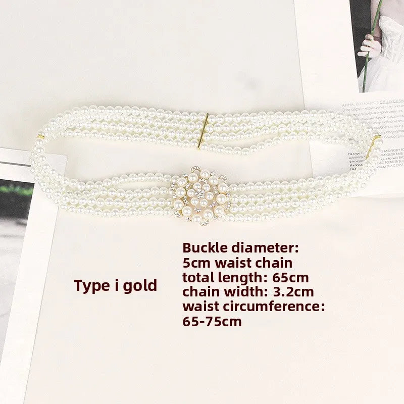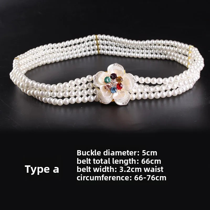 Elegant Four Rows Pearl Decorative Waist Belt Elastic Band Rhinestone Flower Waist Chain Hanfu Women's Fashion Accessory