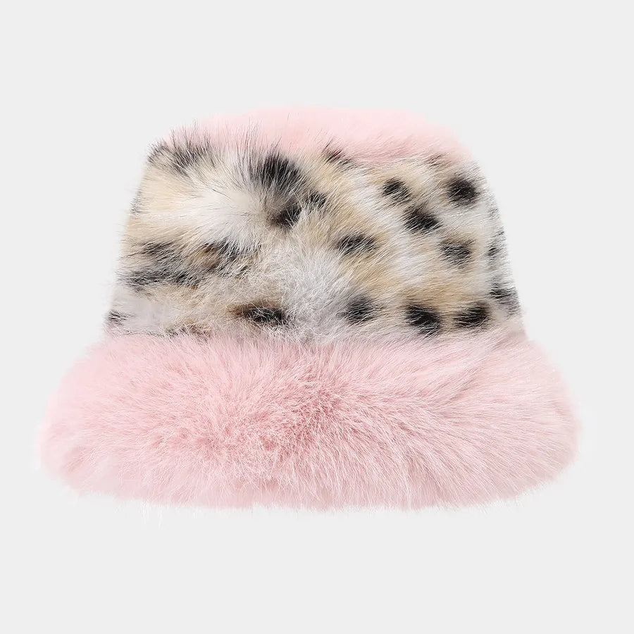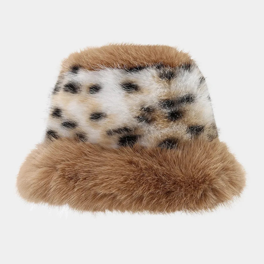 Fashionable Thickened Fur Hat Chic Fisherman Cap Leopard Print Patchwork Face Slimming Winter Autumn Season Large Brim Bucket Hat