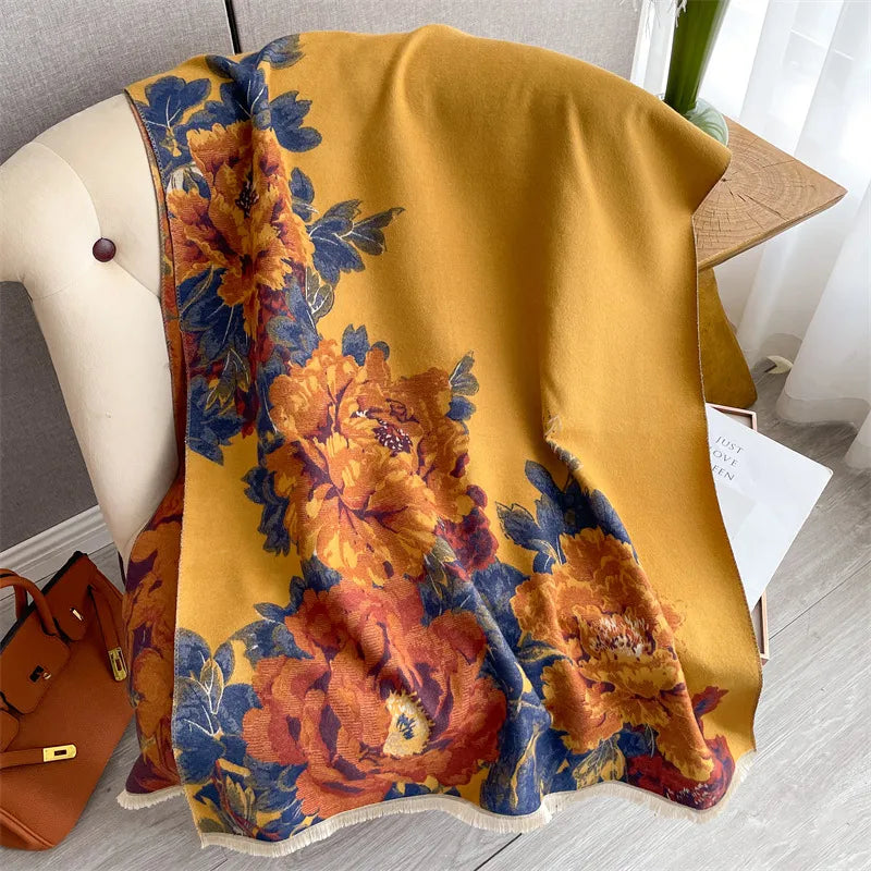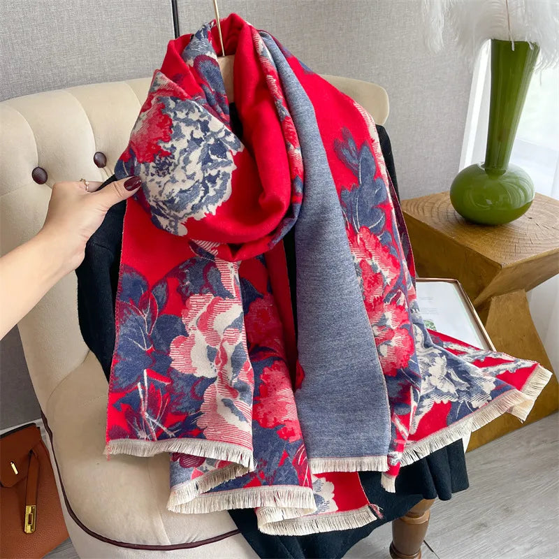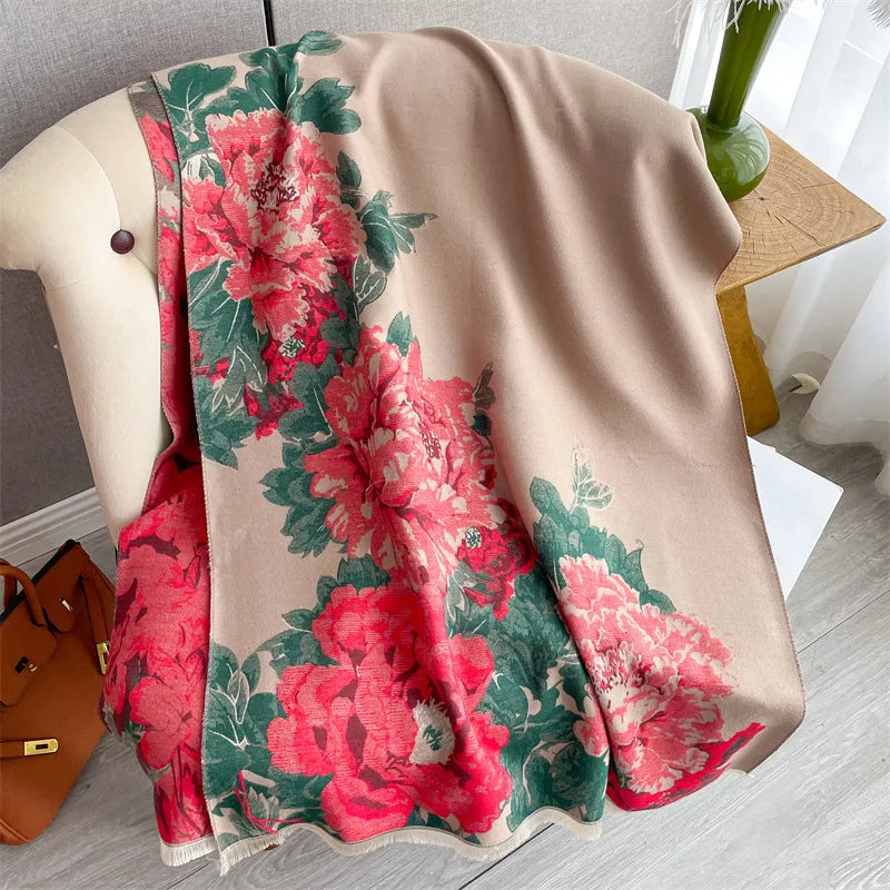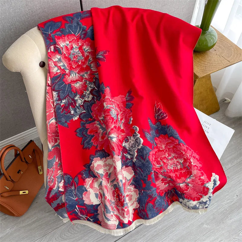 New Winter Thickened Cashmere Scarf Women's Ethnic Peony Flower Warm Neck Warmer Vintage Elegant High-End Feelings Shawl